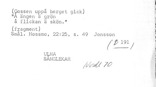 //// (gossen uppå berget gick) //// ,fA ängen ä grön i å flickan ä skön." //// » P //// (fragment) j //// Smål. Hossmo, 22:25, s. 49 Jonsson | //// / P i9i j ; //// ULMA 1 //// SANGLEKAR ! //// /i/en// 7 O ////