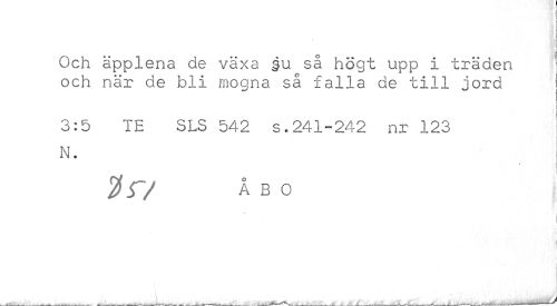 //// y i //// Och äpplena de växa §u så högt upp i träden 5 //// och när de bli mogna så falla de till jord f //// i i //// 3:5 TE SLS 542 s.241-242 nr 123 i //// N. //// $ <r/ åbo ////