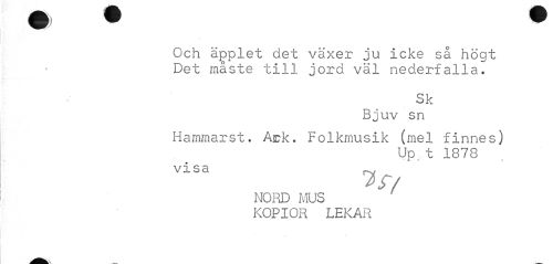 //// Och äpplet det växer ju icke så högt Det måste till jord väl nederfalla. //// Sk //// Bjuv sn //// Hammarst. Ark. Folkmusik (mel finnes) //// Up t 1878 //// visa ^ //// NORD MUS KOPIOR LEKAR ////