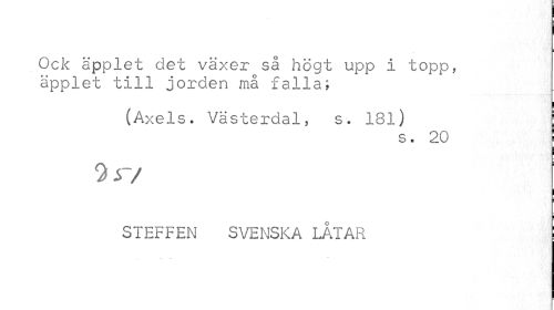 //// i //// Ock äpplet det växer så högt upp i topp, äpplet till jorden må falla; //// ! //// (Axels. Västerdal, s. 181) I //// s. 20 ! //// i //// i //// j //// STEFFEN SVENSKA LÅTAR ! ////