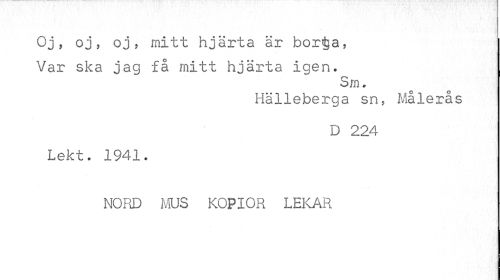 //// Oj, oj, oj, mitt hjärta är bor^a, Var ska jag få mitt hjärta igen. //// Sm. //// Hälleberga sn, Målerås //// D 224 //// Lekt. 1941. //// NORD MUS KOPIOR LEKAR ////