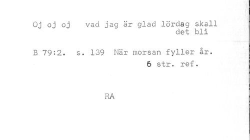 //// Oj oj oj vad jag är glad lördag skall //// det bli //// B 79:2. s. 139 När morsan fyller ar. //// 6 str. ref. //// RA ////