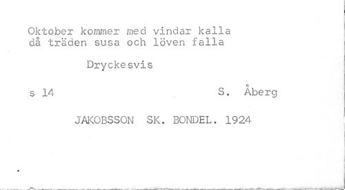 //// Oktober kommer med vindar kalla då träden susa och löven falla //// Dryckesvis //// o //// s 14 S. Åberg //// JAKOBSSON SK. BONDEL. 1924 //// yl //// i //// i //// vi ] ////