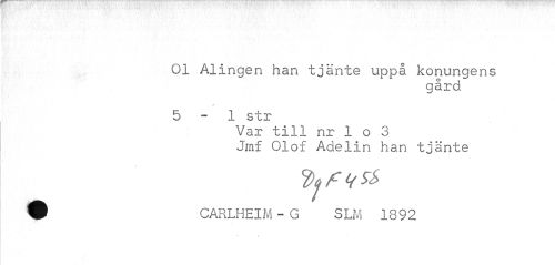 //// 01 Alingen han tjänte uppå konungens //// gård //// 5-1 str //// Var till nr 1 o 3 //// Jmf Olof Adelin han tjänte //// 9 CARLHEIM - G SLM 1892 ////