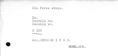 //// Ola Persa stuga. Ds. //// Nordals hd. Dalskog sn. //// D 208 //// Acc.3953:38 I F G H. ^ HORD. MUS. ////
