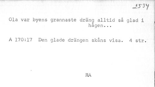 //// jsiy //// Ola var byens grannaste dräng alltid så glad i //// hågen... //// A 170:17 Den glade drängen skåns visa. 4 str. //// k //// RA ////
