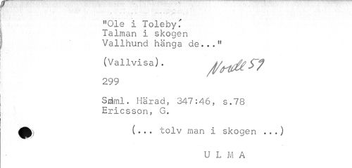 //// "Ole i Toleby.' Talman i skogen Vallhund hänga de...11 //// (Vallvisa). /t/rtiäf? 299 //// Sriml. Härad, 347:46, s.78 Ericsson, G. //// (.. . tolv man i skogen .. .) //// U L M A ////