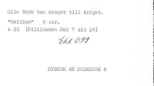 //// i //// Olle Bock han drager till kriget. "Mellbom" 9 str. //// s 23 (Fililuomen Del 7 sid 14) ; //// -fat 0*1 //// ! i //// DYBECK MS FOLKLORE 5 //// 1 ////