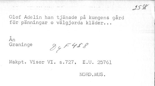 //// — - ---^ -r «. fr r ,-' ---r r ^ T ^^^ ^^^^^ //// Olof Adelin han tjänade på kungens gård för pänningar o välgjorda kläder... //// Ån //// Graninge jy tr^j*/* //// Mskpt. Visor VI. s.727, E.U. 25761 //// 3 //// NORD.MUS. ////