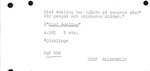 //// Olof Adeling han tjänte på kungens gård" för pengar och välskurna kläder." //// ("Olof Adelinci" s.191 8 str. //// Björklinge DgF 458 //// " grip allmogeliv ////