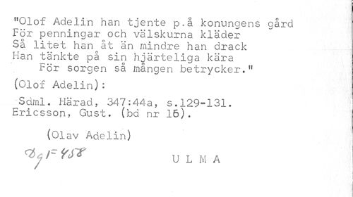//// "Olof Adelin han tjente p.å konungens gård För penningar och välskurna kläder Så litet han åt än mindre han drack Han tänkte på sin hjärteliga kära //// För sorgen så mången betrycker." //// (Olof Adelin): //// Sdrnl. Härad, 347:44a, s.129-131. Ericsson, Gust. (bd nr 16). //// (Olav Adelin) //// U L M A ////