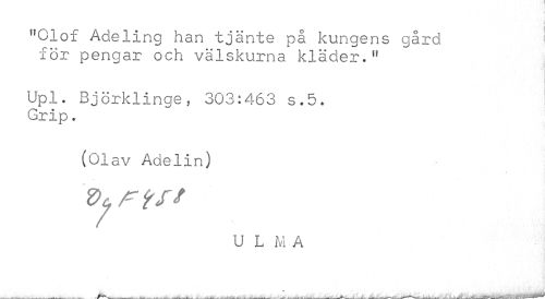 //// "Olof Adeling han tjänte på kungens gård 1 //// for pengar och välskurna kläder." //// Upl. Björklinge, 303:463 s.5. Grip. //// (01 O. v Adelin) //// U L M A ////