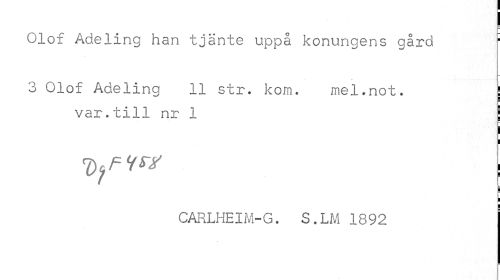 //// I //// Olof Adeling han tjänte uppå konungens gård ¦ //// » / //// 3 Olof Adeling 11 str. kom. mel.not. //// ¦ //// var.till nr 1 j //// Df f w ! //// CARLHEIM-G. S.LM 1892 ////