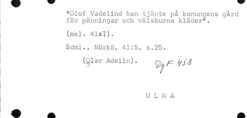 //// "Olof Vadelind han tjänte på konungens gård för pänningar och välskurna kläder". //// (mel. 41x7). //// Sdml., Mörkö, 41:5, s.25. //// » //// (£)lar Adelin). ^ ^ ty^g //// U L M A ////