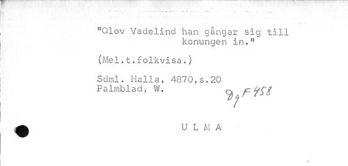 //// ! //// jjj _ - ' ' ¦ 1 . ,'•'.•. //// "Olov Vadelind han gångar sig till //// konungen in." //// (Mel.t.folkvisa.) //// Sdml. Halla, 4870,s.20 Palmblad, W. ^ jz fög //// • U L M A //// v ////