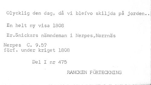 //// \ //// Olycklig den dag, då vi blefvo skiljda på jorden..; En helt ny visa 1808 //// i //// Er.Snickare nämndeman i Nerpes,Norrnäs //// j //// Nerpes C. 9.5? //// förf. under kriget 1808 //// Del I nr 475 //// RANCKEN FÖRTECKNING //// | i ////