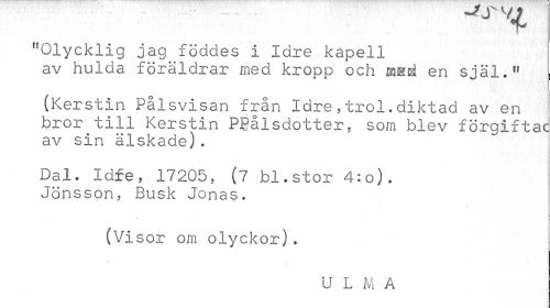 //// "Olycklig jag föddes i Idre kapell av hulda föräldrar med kropp och m&å en själ." , //// (Kerstin Pålsvisan från Idre,trol.diktad av en bror till Kerstin PBålsdotter, sora blev förgiftac av sin älskade). //// Dal. Idfe, 17205, (7 bl.stor 4:o). Jönsson, Busk Jo //// nas. //// (Visor om olyckor). //// U L M A ////