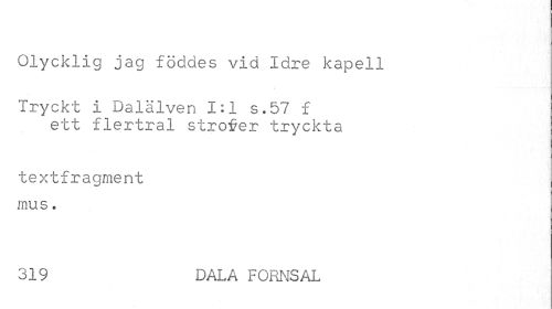 //// Olycklig jag föddes vid Idre kapell //// Tryckt i Dalälven 1:1 s.57 f ett flertral strofer tryckta //// textfragment mus. //// 319 DALA FORNSAL ////