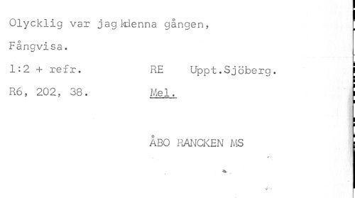 //// Olycklig var jagkienna gången, | //// Fångvisa. //// 1:2 + refr. RE Uppt .Sjöberg. [ //// R6, 202, 38. Mel. //// ÅBO RANCKEN MS //// % ' I ////