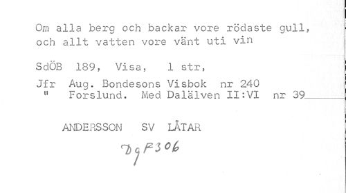 //// Om alla berg och backar vore rödaste gull, och allt vatten vore vänt uti vin //// SdOB 189, Visa, 1 str, | //// Jfr Aug. Bondesons Visbok nr 240 11 Fors lund. Med Dalälven II: VI nr 39_ //// ANDERSSON SV LÅTAR //// i ////
