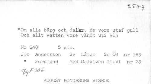 //// 1 C J. //// K //// "öm alla bärg och dalter, de vore utaf gull Och allt vatten vore vändt uti vin //// Nr 240 5 str. //// o * * //// Jfr Andersson Sv Latar Sd OB nr 189 " Forslund Med Dalälven II:VI nr 39 //// AUGUST BONDESONS VISBOK ////