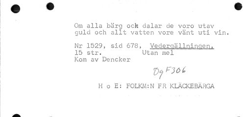 //// Om alla bärg och dalar de voro utav guld och allt vatten vore vänt uti vin. //// Nr 1529, sid 678, Vedergällningen, 15 str. Utan mel //// Kom av Dencker //// Hon: FOLKM:N FR KLÄCKEBÄRGA ////