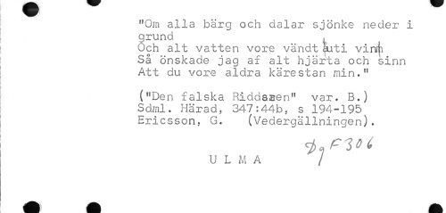 //// "Om alla bärg och dalar sjönke neder i grund , //// Och alt vatten vore vändt åati vinifi Så önskade jag af alt hjärta och sinn Att du vore aldra käre stan min." //// ("Den falska Riddaren" var. B.) Sdml. Härad, 347:44b, s 194-195 Ericsson, G. (Vedergällningen). //// U L M A / ////