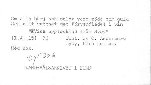 //// Om alla bärj och dalar vore röda som guld Och allt vattnet det förvandlades i vin //// ni^iVisa upptecknad från Hyby'1 //// (l.A. 15) 73 Uppt. av O, Anderberg //// Hyby, Bara hd, Sk. //// Med not. //// cQuflO (> //// LANDSMALSARKIVET I LUND ////