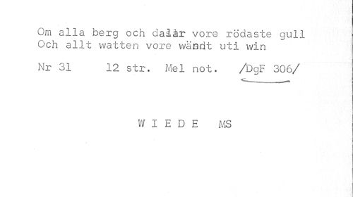 //// Om alla berg och dalar vore rödaste gull Och allt vvatten vore wandt uti win //// Nr 31 12 str. Mel not. /DgF 306/ //// W I E D E MS ////