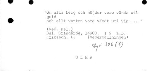 //// "öm alla berg och höjder voro vända uti guld //// och allt vatten vore vändt uti vin . . . .ff (Med. mel.) //// Dal. Grangärde, 14900, s 9 a,b, //// Eriksson, L. (Vedergällningen) //// U L M A ////