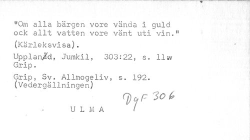 //// i J < • • .' //// "Om alla bärgen vore vända i guld ock allt vatten vore vänt uti vin." //// (Kärleksvisa). //// Upplanjfd, Jumkil, 303:22, s. 11 w Grip. //// i //// Grip, Sv. Allmogeliv, s. 192. (Vedergällningen) //// U L M A / ////