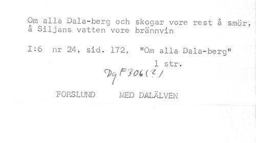 //// Om alla Dala-berg och skogar vore rest å smör, å Siljans vatten vore brännvin //// 1:6 nr 24, sid. 172, »Om alla Dala-bero" //// 1 str. //// rpcjFloti*/ //// FORSLUND MED DALÄLVEN ////