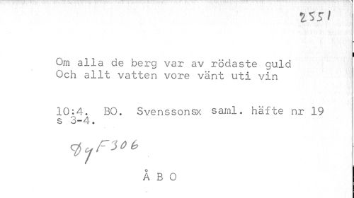 //// 2.55/ //// I //// Om alla de berg var av rödaste guld Och allt vatten vore vänt uti vin //// 10:4. BO. Svenssonsx saml. häfte nr 19 s 3-4. //// c^ojFlob //// ÅBO ////