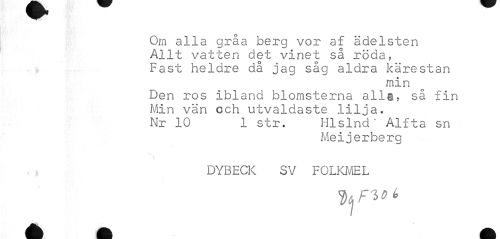 //// Om alla gråa berg vor af ädelsten Allt vatten det vinet så röda, Fast heldre då jag såg aldra kärestan //// min //// Den ros ibland blomsterna alla, så fin Min vän och utvaldaste lilja. Nr 10 1 str. Hlslnd ' Alfta sn //// Meijerberg //// v //// DYBECK SV FOLKMEL ////