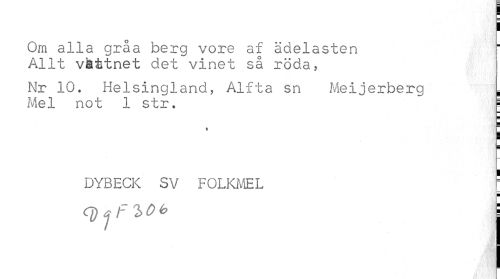 //// Om alla gråa berg vore af ädelasten Allt vfcitnet det vinet så röda, //// Nr 10. Helsingland, Alfta sn Meijerberg i //// Mel not 1 str. i //// ¦ //// t - //// : //// DYBECK SV FOLKMEL F //// r //// qj^f^Ob t ////