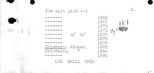 //// (Om allt gick --) 2' //// • ---1865 //// *) ---1867 | O-4 //// ---1870 //// I I : -- --- 1872 / W //// ' * r --- a/ b/ 1874 / //// ---1875 //// ---1876 //// Grimborg, Kämpen, 1885 Grindborg, " 1888 ---1890 //// LUS SKILL UNIK ////