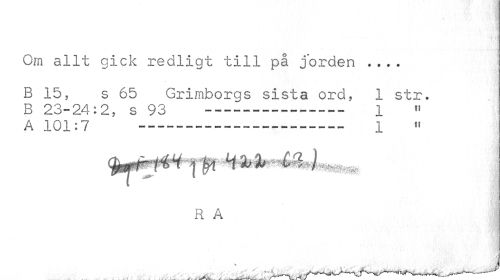 //// Om allt gick redligt till på jorden //// B 15, s 65 Grimborgs sista ord, 1 str. //// B 23-24:2, s 93 --- 1 " //// A 101:7 --- 1 » //// R A //// i ////