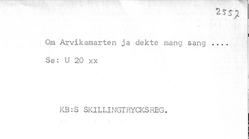 //// IllI //// ¦ //// i //// Om Arvikamarten ja dekte mang sang ... Se: U 20 xx //// | //// KB:S SKILLINGTRYCKSREG. //// ... ////