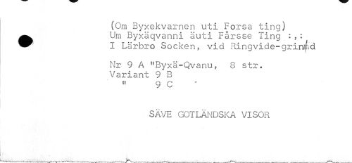 //// (Om Byxekvarnen uti irorsa ting) //// •Um Byxäqvanni äuti Fårsse Ting :,: //// 1 I Lärbro Socken, vid Ringvide-grim/id //// i //// Nr 9 A "Byxä-Qvanu, 8 str. Variant 9 B " 9 C //// SÄVE GOTLÄNDSKA VISOR ////