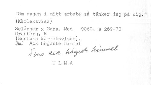//// HQm dagen i mitt arbete så tänker jag på dig." (Kärleksvisa) //// Selånger x Guna, Med. 9060, s 269-70 Granberg, E //// (Enstaka kärleksvisor). Jmf Ack högaste himmel //// \ //// U L M A ////