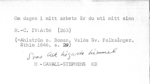 //// Om dagen i mitt arbete är du uti mitt sinn H.-C. IV:A:56 (263) //// (=Ahlström o. Boman, Valda Sv. Folksånger, Sthlm 1846, s. 29) //// H - C AV AL L - S T EP H ENS KB ////