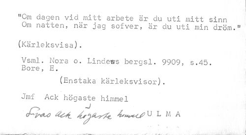 //// "Cm dagen vid mitt arbete är du uti mitt sinn Om natten, när jag sofver, är du uti min dröm." //// (Kärleksvisa). //// Vsml. Nora o. Lindews bergsi. 9909, s.45. Bore, E. //// (Enstaka kärleksvisor). Jmf Ack högaste himmel //// ' /u^A^I&i buv+tJ?^ L M A //// '¦ ¦ , ' j . ---.___u... r___IM -L ___ - ... ---2---w... 'LJ .r.' - ... —- ; ////