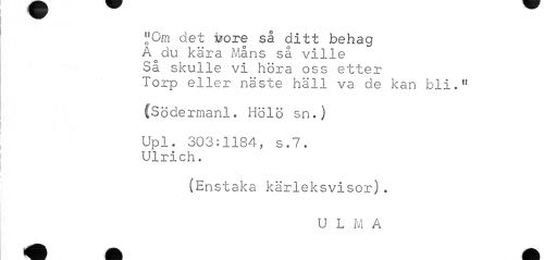 //// JJOm det foore så ditt behag //// A du kära Måns så ville //// Så skulle vi höra oss etter //// Torp eller näste häll va de kan bli.n //// (Södermani. Hölö sn.) //// Upl. 303:1184, s.7. Ulrich. //// (Enstaka kärleksvisor). //// U L M A ////