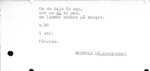 //// Om du Maja är med, //// och om du är med, //// om lammen bräker på berget. //// s. 58 //// 1 str. //// Fårvisa. //// widholm hälsingerunor ////