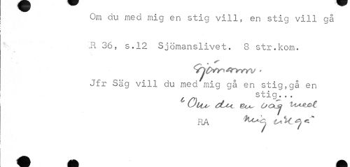 //// Om du med mig en stig vill, en stig vill gå //// JR 36, s.12 Sjömanslivet. 8 str.kom. //// - //// Jfr Säg vill du med mig gå en stig,gå en //// ^ stig... //// ÖlUs dLu. OCXSj UAJl&t //// RA t*%c ////