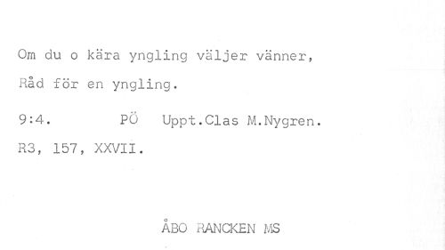 //// Om du o kära yngling väljer vänner, Råd för en yngling. //// 9:4. PÖ Uppt.Clas M.Nygren. //// R3, 157, XXVII. //// ÅBO RANCKEN MS ////