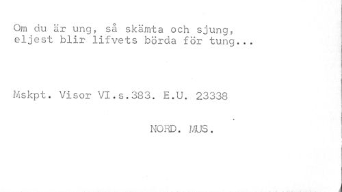 //// j //// Om du är ung, så skämta och sjung, eljest blir lifvets börda för tung... //// Mskpt. Visor VI.s.333. E.U. 23338 //// ? \ //// NORD. MUS. ////