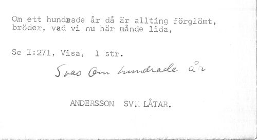 //// Om ett hundztade år då är allting förglömt, bröder, vad vi nu här månde lida, //// Se 1:271, Visa, 1 str. //// i i //// ANDERSSON SVK LÅTAR. //// ^ ___J^ ___I___,___~__få---"J^L---^---^ ////