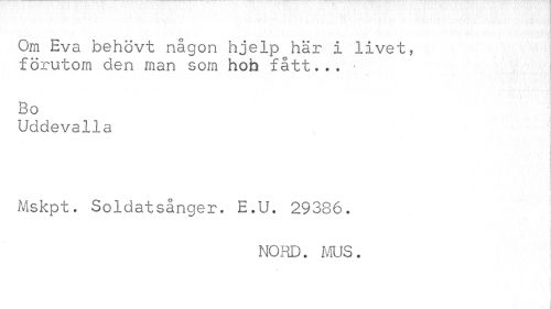 //// Om Eva behövt någon hjelp här i livet, //// förutom den man som hob fått... • j //// Bo //// Uddevalla //// Mskpt. Soldatsånger. E.U. 29386. //// NORD. MUS. ////