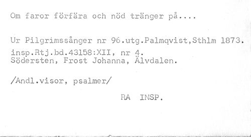 //// Om faror förfära och nöd tränger på.,.. //// Ur Pilgrimssånger nr 96.utg.Palmqvist,Sthlm 1873. //// insp.Rtj.hd.43158:XII, nr 4. Södersten, Frost Johanna, Älvdalen. //// /Anal.visor, psalmer/ //// RA INSP. ////